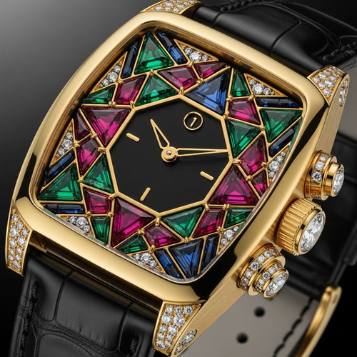 Imperial Mosaic™ Gold Luxury Watch – Diamond Crown Multicolor Gem Edition